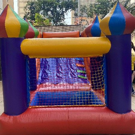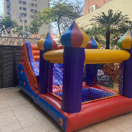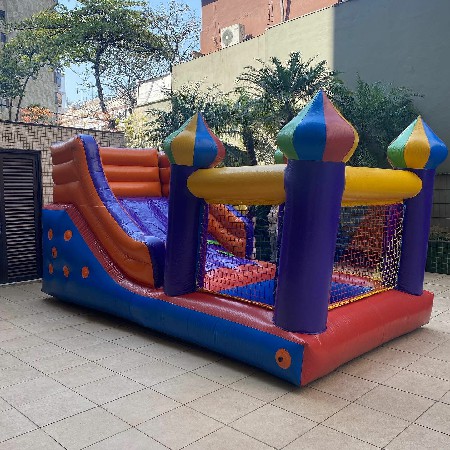 Tobogã Inflável com piscina de bolinhas multicolorido e versátil. Super divertido e de cores vibrantes, chamando a atenção das crianças. Projetado para ter máxima segurança e conforto.