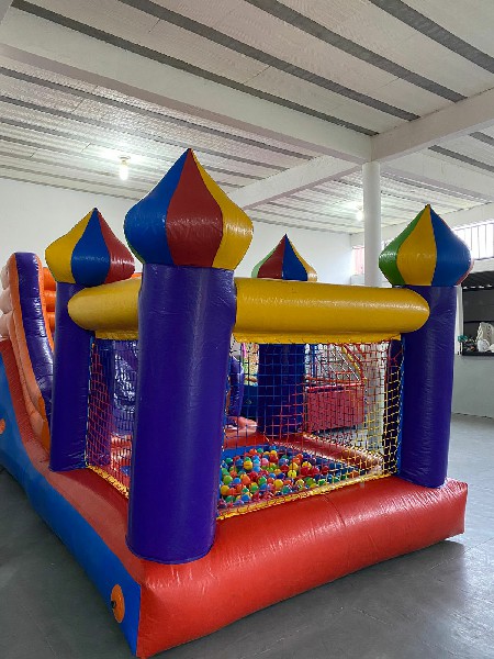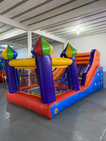 Tobogã Inflável com piscina de bolinhas multicolorido e versátil. Super divertido e de cores vibrantes, chamando a atenção das crianças. Projetado para ter máxima segurança e conforto.